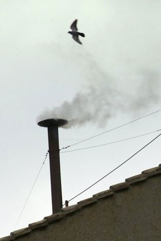 Smoke belches from the chimney erected on the roof of the Sistine Chapel. White smoke means a Pope has been elected. Black smoke indicates no decision.